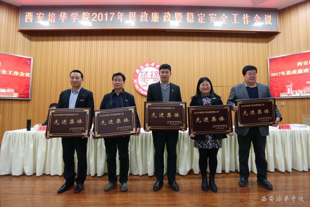 会上,王拴才校长宣读了《关于表彰2016年度省级“平安校园”创建工作先进集体和先进个人的通报》,对校长办公室等5个“平安校园”创建先进单位和赵彦博等27名先进个人予以通报表彰。同时,王校长与会计学院、传媒学院、教务管理中心、后勤服务与保障中心等二级部门负责人签订年度稳定安全责任书。