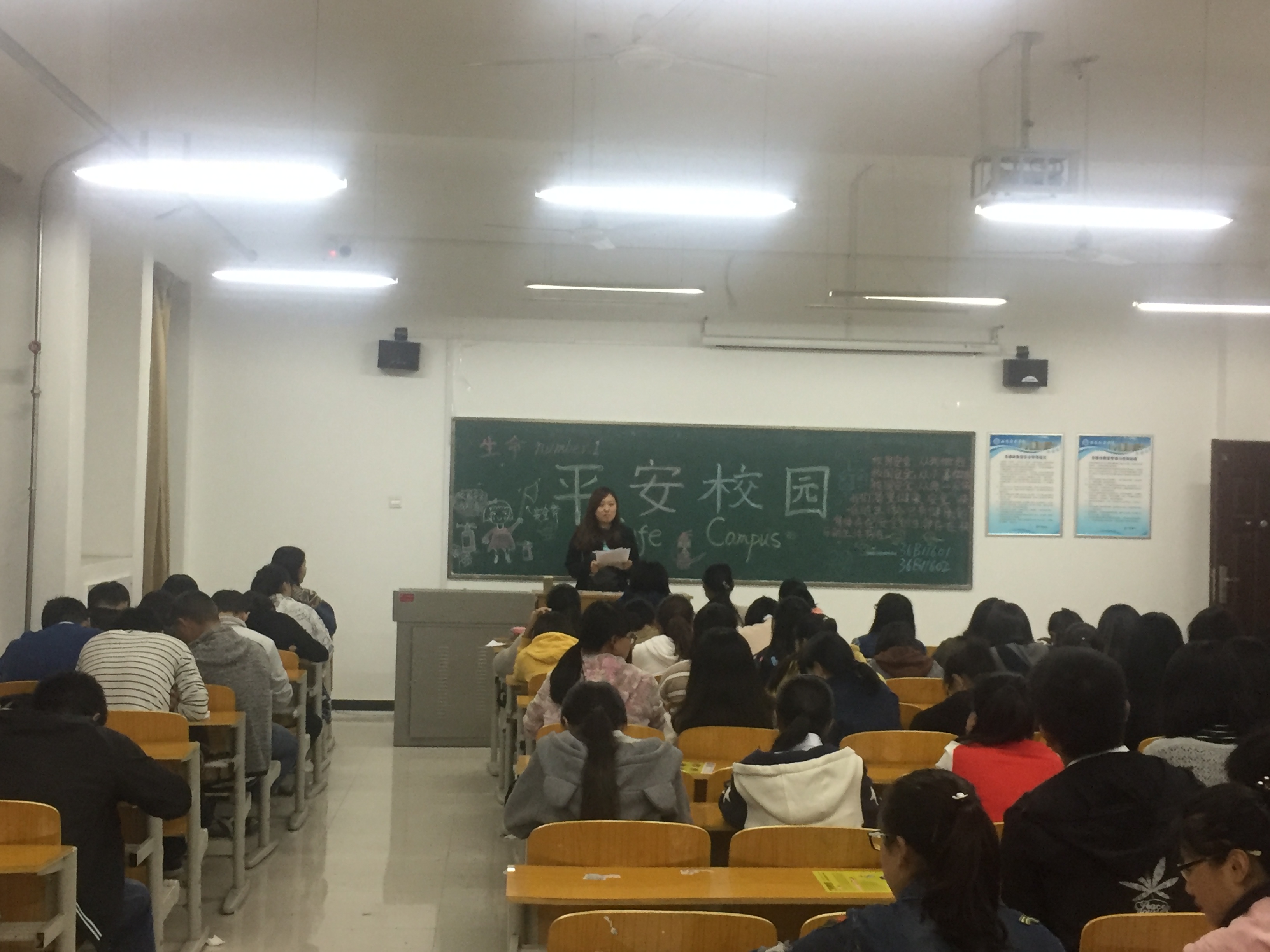为增强同学们的安全防范意识,提高同学们的安全防范能力,全面普及校园安全常识,人文学院导员组织各班级开展了以“平安校园”为主题的班会,此次班会于 10月16日晚7:00在汇知楼召开,院全体学生参加了此次班会。