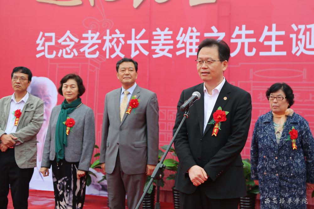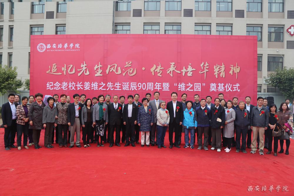 为缅怀著名教育家姜维之先生为我国民办教育事业、为西安培华学院做出的杰出贡献,10月11日,我校举行纪念老校长姜维之先生诞辰90周年暨“维之园”奠基仪式,校长王拴才主持仪式。韩国海军前参谋总长黄基铁大将,中国延安精神研究会理事、北京延安儿女联谊会会长胡木英女士,中共中央办公厅第一副主任冯文彬之女冯延曦女士,毛泽东主席胞弟外孙曹宏先生,姜维之先生的家属代表、我校师生代表300余人参加奠基仪式。