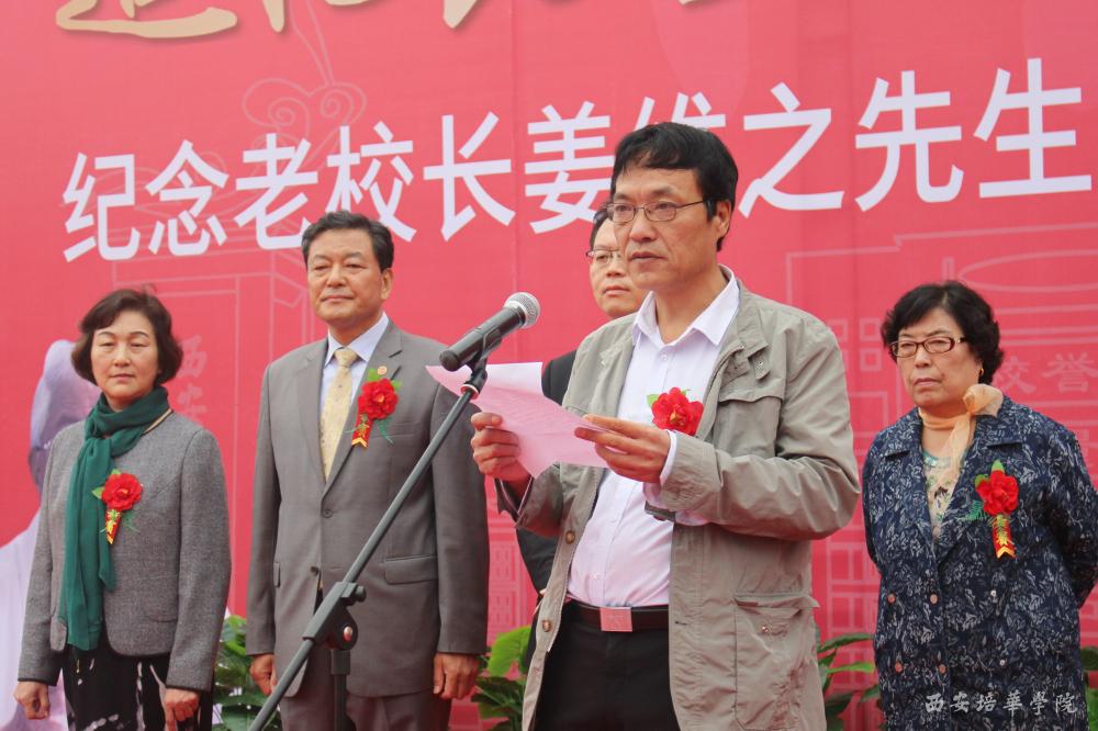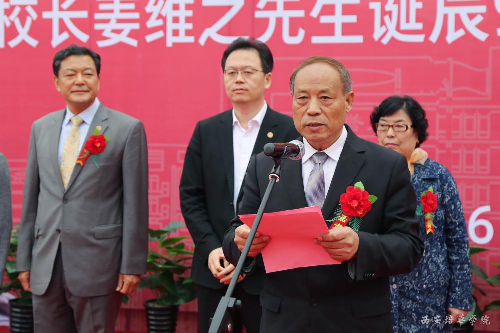 省政协常委、我校理事长姜波致辞。他首先对前来参加“维之园”奠基仪式的领导及嘉宾表示诚挚的感谢。他讲到,姜维之老校长出生于河南省南阳市镇平县,一九四九年八月起执教于培华,25岁担任西安培华财经学校校长,是新中国当时最年轻的校长之一。1958年被错划为“右派”,受尽磨难,为了追回失去的二十年宝贵年华,1984年姜维之先生恢复创建新中国第一所女子大学——西安培华女子大学。