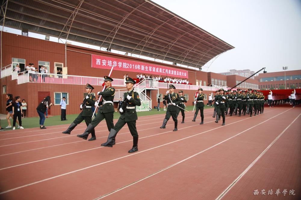 表演队伍中,首先上场的是培华颂歌方队,《培华颂歌》和《强军战歌》等歌,让看台上的人们受到感染,不禁轻轻的哼着歌;女子队列方队的同学们,骄阳似火,他们没有畏惧;挥汗如雨,他们依旧豪情万丈!匕首操方队的表演可谓叫人大开眼界,尤其是几个倒功,动作一气呵成,引得掌声雷动,执勤手势做的规则整齐;军体拳方队取百家之长,深受广大武术爱好者的喜爱,同学们的表演认真到位,完美的体现了军体拳对培养军人坚韧不拔的意义;擒敌拳方队由女生组成,她们的呐喊声丝毫不输于男生,可谓巾帼不让须眉;花样方队迈着矫健的步伐,喊着嘹亮的口号,充满朝气。舞蹈表演方队,奔放的舞姿,伴随着音乐为青春喝彩,学校的官网网址在操场上空响彻,“中国梦”、“我的梦”,我们大家的梦在操场上呈现;战术方队,持枪在绿色的操场上飞奔,每次停下来的时候,都引得人们欢呼呐喊。2016级新生的表演精彩绝伦,让人们感觉到了他们的青春活力。