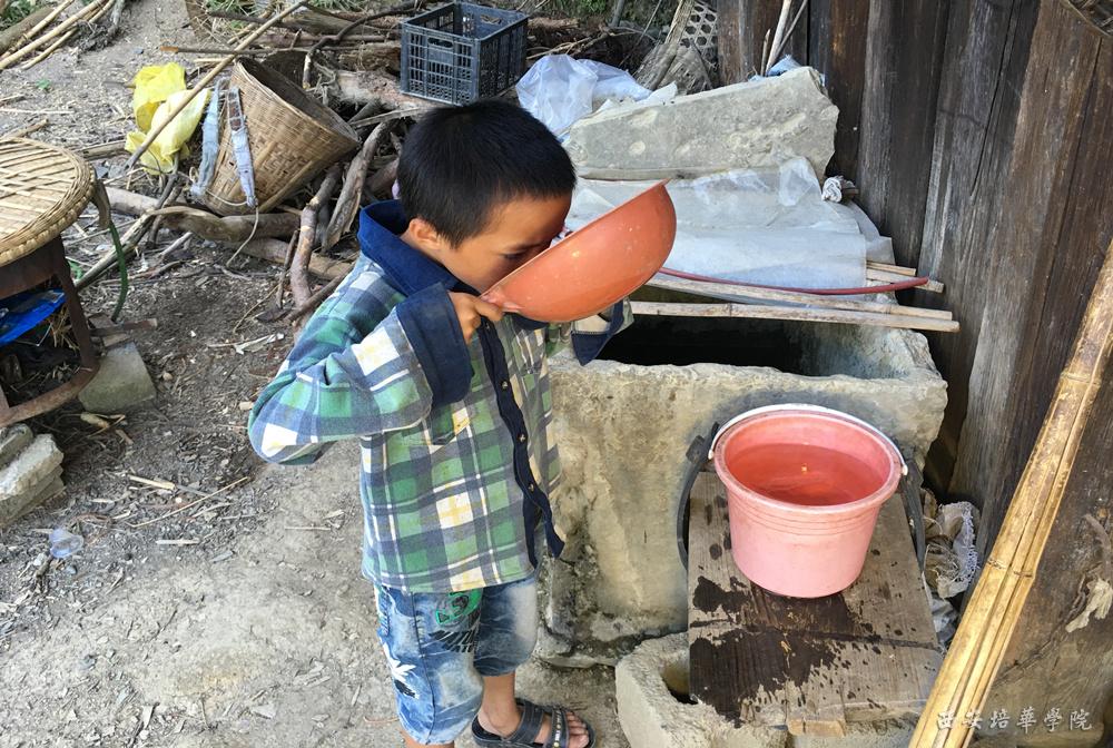 到达孩子家时,有些中暑,去水窖用瓢舀起来的水有些浑浊,很难下咽,了解后得知,他们吃的水是雨水充足时引流下来的山泉水、雨水,但是山泉水会干,没水的时候他们俩只能走很长时间去山下河里挑水吃,两个孩子每天只吃下午的那顿饭,并且已经一年度没吃过肉了,无法想象两个小孩子在如此困难的情况下是怎么继续坚持求学的!