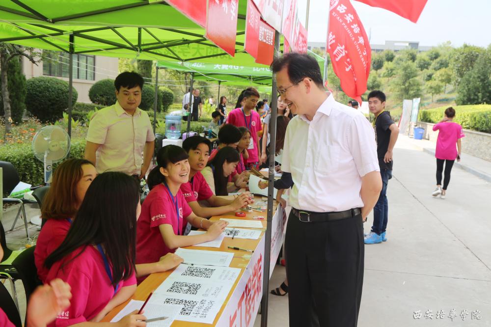 下午2时许,王校长一行来到格物楼西广场,询问学生报名情况,在国际交流中心展位前,王校长与该中心负责人亲切交谈,在听取有关情况介绍后给予肯定和鼓励。