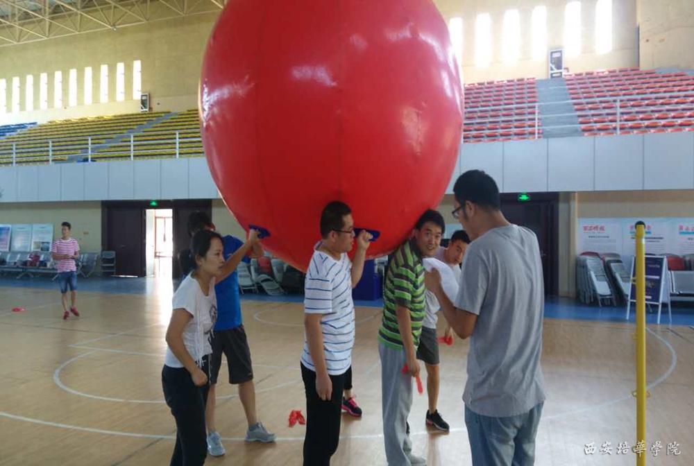 “顶球收绳”——每支参赛队伍派出12名成员分两组分别顶着大型充气球障碍跑,跑动过程中,每名参赛队员均需拾取障碍周围红绳,并在接力中回答相关业务知识问题方可过关,用时最短的队伍获胜。