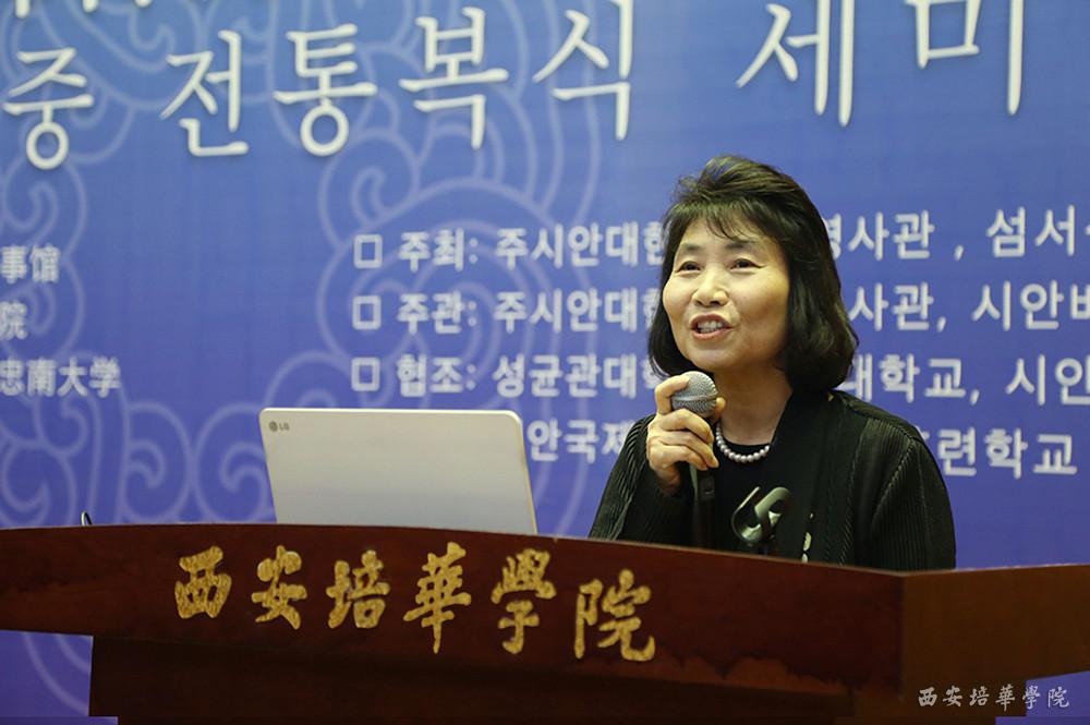 研讨会上,我校艺术设计学院的学生们身着精致的服饰服饰,进行了中韩传统服装动态展演,展现了中韩两国服饰文化的精彩和繁荣,激发青年学子的创意创新思路,从而在文化传承方面做出积极的贡献。韩国成均馆大学赵又玄教授作了题为“近代朝鲜婚礼礼服的区域特征和造型性”的报告,韩国忠南大学朴春顺名誉教授作了“关于传统韩服文化产业化实例的研究——以电视剧和电影‘黄真伊’为例”的主题报告。西安美术学院的陈霞教授以及我校李媛教授分别带来主题为“西方‘中国风’服饰设计研究”“民国时期服饰艺术特色”的报告。与会学生与专家们进行了互动,咨询了关于中韩传统服饰方面的相关问题,并得到了专家们的回复。