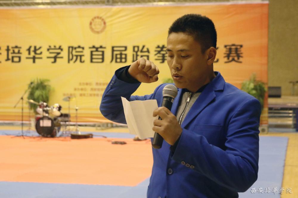 体育部主任雷耿华宣布本次跆拳道比赛前期宣传展板的评比结果