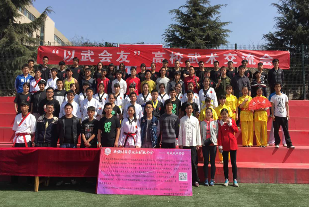 高校武术交流会在我校举行:近日,由尚武武术协会举办的“以武会友”高校武术主题交流会在我校体育场举行,12所高校的武术社团参加了此次活动。各高校将训练分成散打队,武术套路,双截棍等,由每一位学校的教练或队长去带领,各取所需,取长补短。交流会期间,气氛活跃,互动热烈,武友们都各有收获,受益匪浅,训练完成后,大家分别拿出自己的绝活进行落幕汇演,精彩绝伦,掌声不断。