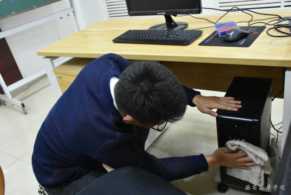 国旗护卫队队员认真清洁大商科综合实训的中的卫生环境