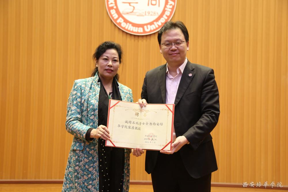 姜波理事长向省书协副主席、西安市书协主席石瑞芳女士颁发客座教授聘书
