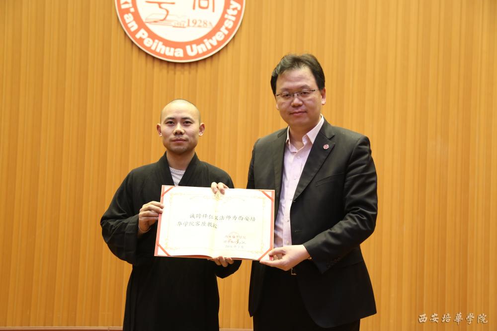 姜波理事长向扬州大明寺石涛画院院长释仁果颁发客座教授聘书