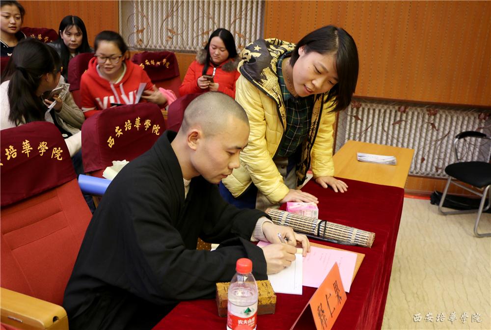 随后,姜波理事长向省书协副主席、西安市书协主席石瑞芳女士,日本著名书法家松宫贵之,扬州大明寺石涛画院院长释仁果颁发客座教授聘书,与会领导和嘉宾合影留念。在作品点评互动环节,书法家们对我校茂林书画协会学生的书法绘画作品进行点评,并耐心解答同学们在创作中遇到的问题,同学们表示受益匪浅。书法家们还现场挥毫泼墨,向同学们展示中国书法艺术的魅力。通过活动的举办,不仅提高了学生们对汉字书法的了解,还丰富了学生的课余文化生活。
