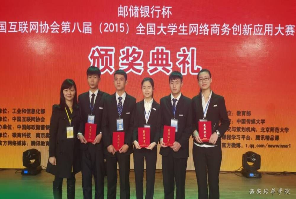 经过激烈角逐,我校商学院学生郝康峰,李月,张浩杰,赵鹏程和赵安琪(指导老师王西娅、王艳)组成的金辰team团队在比赛中展现出了良好的商务创新应用能力和卓越的团队创业精神,其参赛项目《校园O2O生活服务平台开发》获得全国总决赛特等奖,西北赛区特等奖的优异成绩。