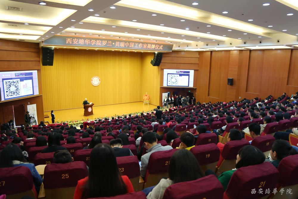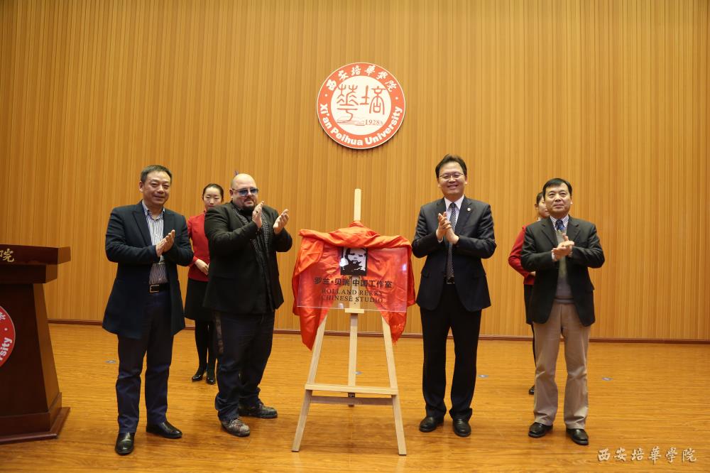 揭牌仪式上,罗兰·贝瑞(Rolland Berry)美国工作室成员和中国工作室成员,陕西省教育厅国际处副处长郭宏毅,美国厚朴公司董事长徐耀辉,美国BG公司董事长张青苏,陕西融鑫房产总经理王旭东,新加坡讯通集团中国区域总经理陈磊,陕西关天之窗CEO马可,西安宝迪名品公司总经理许敏等出席活动。