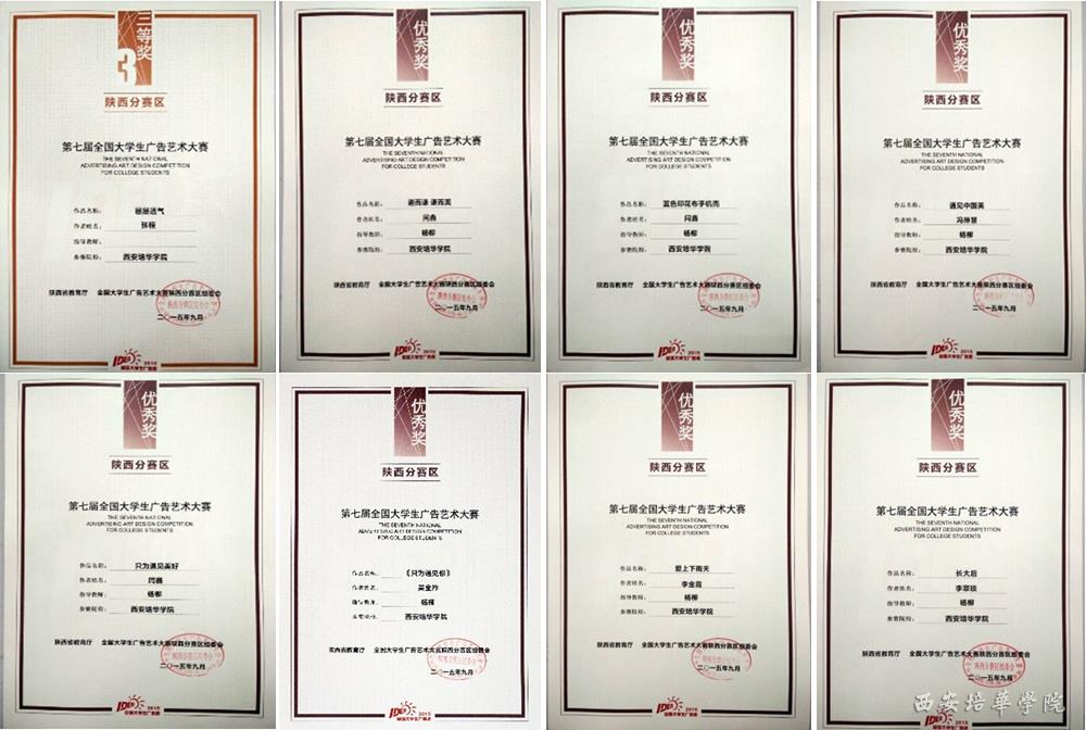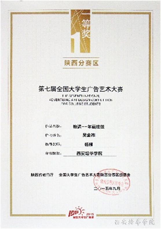 近日,从2015第七届全国大学生广告艺术大赛上传来喜讯,我校艺术设计学院视觉传达设计专业冯琳慧、吴金祚、闫鑫、李金霞、张程、李翠琰六位同学在杨柳老师的指导下,获得该项赛事陕西分赛区一等奖一项,三等奖一项,优秀奖七项。