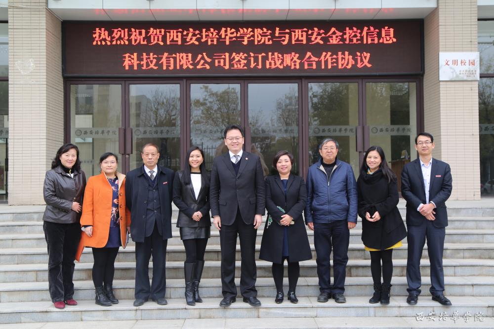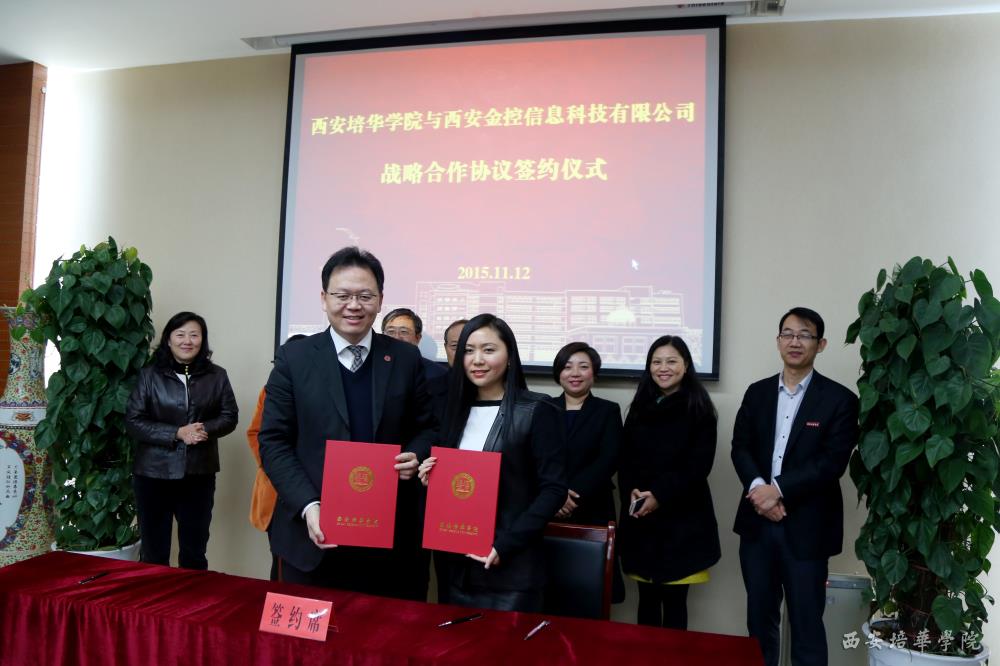 11月12日,西安金控信息科技有限公司董事长房瞾华女士与我校理事长姜波在明德楼会议厅签约了战略合作协议。协议的签署,有利于学生把在校所学的知识与企业实践有机结合,实现学校和企业的设备、技术实现资源共享。同时,利用公司的客户源为在校学生提供全案例教学,仿真教学,提高我校学生的实践能力,为学生的就业创造更多的机会。