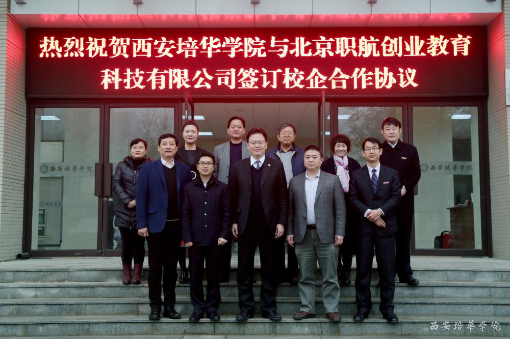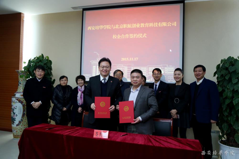 参加签约仪式的还有:北京职航创业教育科技有限公司创始人、副总经理李健,北京职航创业教育科技有限公西北大区总监史良,培华校友、北京职航创业教育科技有限公西北大区运营总监高鹏。我校校长助理秦海锋、教务管理中心主任唐学学、会计学院院长赵选民、中兴电信学院院长程国建、商学院常务副院长王西娅、招生与就业指导中心主任鲍伟等。