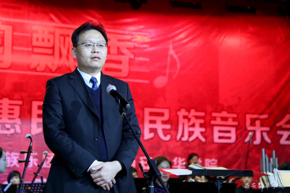 姜波理事长发表致辞,感谢陕西省歌舞剧院民族乐团艺术家们为大家带来精彩的演出,并提出陕西省文化惠民活动是省政府为大学生所创办的,让艺术进校园的活动,4年以来这项活动已然越来越成熟,而我校与陕西省歌舞剧院之间的感情也更加深厚,我们的学生也能感受到艺术的魅力,对活动的热情度也逐年增长,最后,预祝此次文化惠民演出活动圆满成功。