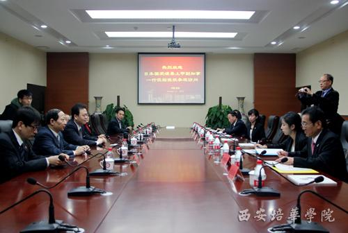 10月31日上午,经陕西省人民政府外事办公室,陕西省人民对外友好协会推荐,日本国爱媛县副知事上甲启二先生率领爱媛县代表团一行八人来我校进行参观访问。我校理事长姜波、校长王拴才、国际语言文化学院院长刘建强、国际交流中心主任秦泉安等在明德楼第一会议室热情接待了访问团一行。