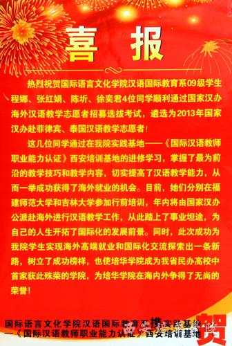 近日,我校国际语言文化学院汉语国际教育系09级学生程娜、张红娟、陈圻、徐奕君4位同学顺利通过国家汉办海外汉语教学志愿者招募选拔考试,遴选为2013年国家汉办赴菲律宾、泰国汉语教学志愿者。