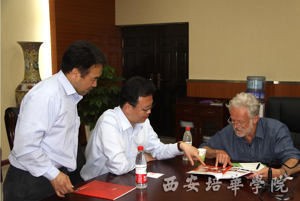 姜波理事长向荣大伟主席介绍了培华84年的办学历史,开创中国民办高等教育先河,学校办学特色等;荣大伟主席也向姜理事长介绍了新中友协以及中国工合国际委员会在新西兰和中国着力参与加强新中友谊、友好往来和文化教育交流等情况;他还特别介绍了新中友协过去几年在陕西与省妇联、省农业厅开展扶贫、农村妇女就业和农民专业合作社建设指导等方面的工作。今年适逢新中友协成立60周年,工合国际在新西兰组织了庆典活动,得到新中友协和中国驻新使馆的大力支持,目前正在组织更多的新西兰友人来华访问,并计划今年秋天在陕西举办一系列活动;荣大伟先生还介绍了有关路易艾黎和今年即将在中国举行的“培黎工艺学校”70周年纪念的计划。