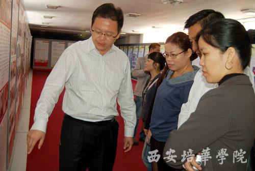 在校史展厅,大家不约而同地聚集到校歌展牌前,几位校友一致说道“我们一起唱校歌吧”,于是,“古都西安、有我培华……”理事长、十几位校友以及学生代表共同在展厅入口处唱起了《培华颂歌》,这些昔日同窗和自己的学弟学妹们一起唱着这首温馨的属于自己的歌,高兴和激动将深沉的校歌传得悠远。在校史长廊里,校友们专注地倾听着理事长对学校师资队伍、教学科研、学生社团、等方面的介绍。