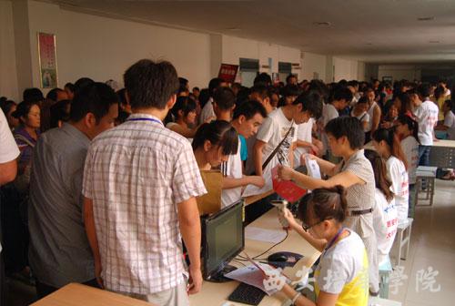 新生报到工作主要在1号教学楼进行。教学楼门口设有新生咨询点,工作人员负责引导新生报到和对新生提出的问题进行解答。一进楼门就是新生报名流程表打印处,流程表设计的报到流程科学合理,极大程度的方便了新生报到,使报到更加方便快捷。各学院的新生登记处、学生处的宿舍录入点、财务处的数十个缴费点、保卫处的户口迁移移点、医务室的体检办理处以及校园卡和公寓物品领取处等所有环节都有序进行,整个迎新工作有条不紊。