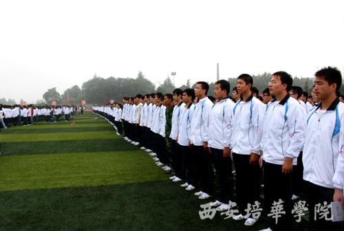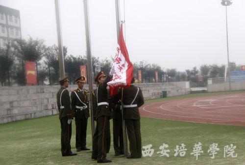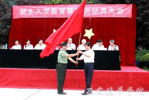 大会在庄严嘹亮的国歌声中正式开始,杨定君副院长宣读了《西安培华学院2011级新生入学教育实施方案》,就本次军训的时间安排、地点分布、连队编制及训练内容和要求等作了周密细致的部署。王斗虎书记向军训团授旗,正式委托省军区教导大队对我校2011级新生进行施训。