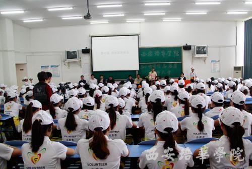 副院长王根性为志愿者授旗。授旗仪式结束后,全体志愿者起立,举起左手庄严宣誓:“我志愿加入2011西安世园会志愿者行列,做一名光荣而优秀的志愿者。我承诺,尽己所能,不计报酬,坚守岗位,服从安排,践行志愿精神,为世园会的胜利召开提供最好的服务!”