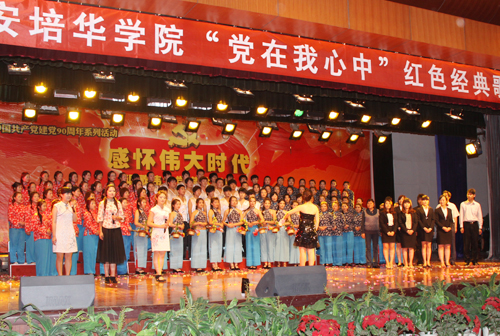 为庆祝中国共产党建党90周年,讴歌伟大的党和伟大的祖国,我校举行了一系列庆祝活动。5月20日下午,我校在长安校区大学生活动中心举行“党在我心中”红色经典歌曲演唱会,表达对党的热爱和伟大祖国的歌颂。我校院长陈明华,党委书记王斗虎,副院长杨定君、王根性、刘应南、王拴才等领导以及师生代表1000多人共同观看了演唱会。