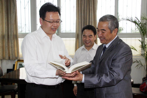 在听完姜理事长的介绍后,安主席作了热情洋溢的讲话。他说,自己曾经通过陕西省相关领导的推荐和前期调研,对我校的办学历史、教学管理、专业特色等办学情况有所了解。此次来访的目的是希望能够和我校就接收哈萨克斯坦留学生、学术文化合作交流等项目的具体落实达成共识。安主席还盛情邀请姜理事长能够参加于五月中旬在世园会举办的哈萨克斯坦文化展。最后,姜波理事长代表我校向来访客人赠送礼品并合影留念。
