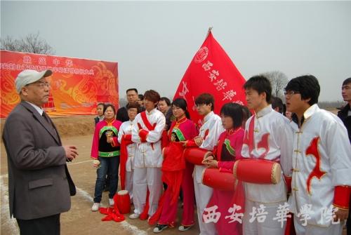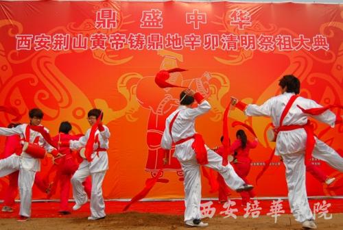 春日的荆山原风和日丽,众多炎黄儿女心怀虔敬,喜聚阎良荆山黄帝铸鼎地,拜谒中华民族的始祖轩辕黄帝,共同祈福华夏繁荣昌盛。来自社会各界的1000余人了参加祭祖大典。上午10时,祭祀大典正式开始。击鼓三十四咚,礼炮三十四响,代表全国三十四个省、市、自治区、特别行政区崇敬先祖的共同心声。接着,护鼎儿女代表向黄帝像敬献供品。在优雅的祭乐中,参祭人员依次向黄帝像敬献了花篮。在宣读祭文后,全体参祭人员满怀对黄帝的敬仰,向轩辕黄帝像三鞠躬。整个祭祀活动简朴、整齐、庄重,具有很强的感染力,受到参祭人员的一致好评。在乐舞祭祀环节,我校安塞腰鼓社的同学进行了气势恢宏的腰鼓表演,受到全体参祭人员的一致好评。