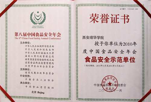 日前,由中华人民共和国科技部、农业部、海关总署、国家工商总局、国家质检总局、国家食品药品监管局和北京市食品安全委员会共同主办,国家发改委和中国食品工业协会共同支持,中国食品质量报社独家承办,全国高科技食品产业化委员会和中国民族贸易促进会联合协办的第八届中国食品安全年会在北京隆重举行,本届年会以“确保食品安全,构建和谐社会”为主题。我校在本届年会上被专家委员会评为“全国食品安全示范单位”称号。