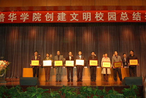 副院长王根性、段茂贤分别宣布了《文明校园创建先进单位和先进个人的表彰决定》和《创建文明校园学生先进个人的表彰决定》。文法学院等16个单位荣获为先进单位,绿化修缮科等4个科室荣获为先进科室。大学生艺术团等3个团体荣获为先进集体。江俊瑞等187人荣获为先进个人。2644名学生荣获为文明校园创建先进个人。全体校领导依次为获奖单位代表和个人代表颁发了荣誉证书。