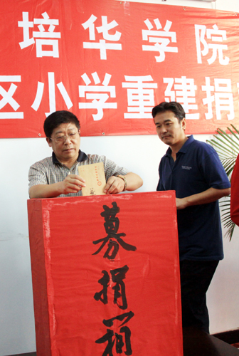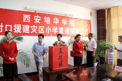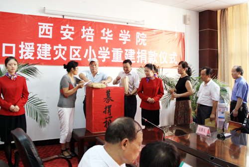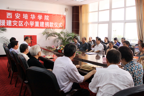 9月17日下午,我校对口援建平利县老城区凤凰小学灾后重建捐款仪式在长安校区举行。陈明华院长、王斗虎书记、副院长杨定君、段茂贤、刘应南、王拴才和院长助理姜朗出席了捐款仪式,并带头捐款。各院(部)、处(室)主要负责同志捐献了本部门募捐的款项。因公务在外的姜波理事长、陈胜秋副院长、王根性副院长也委托代为捐款。副院长、援建工作领导小组副组长王拴才主持捐款仪式并作简短讲话。
