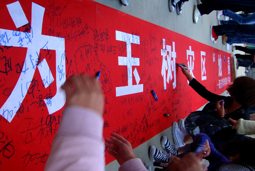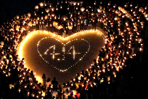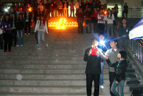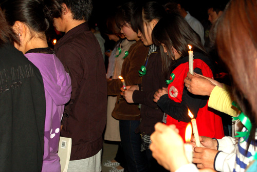 活动当晚,大学生活动中心广场的氛围显得庄严肃穆,在场地正中央摆放着由蜡烛组成的“4·14”图案,图案四周被默默为灾区祈祷的同学们围成了巨大的“心”型。参加祈福活动的同学手持白烛,胸前佩戴绿丝带。大家还纷纷在印有“为玉树灾区‘烛’福”主题的条幅上签名留念并写下祝福。