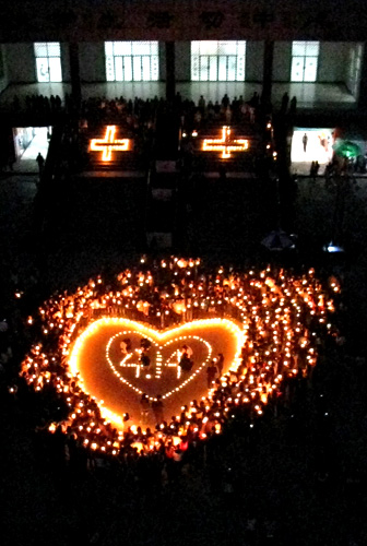 在主持人深情的朗读声中,祈福活动正式开始。同学们依次点亮了寄托哀思和希望的蜡烛。“请大家为青海玉树灾区人民默哀三分钟”,主持人话音刚落,同学们缓缓低下头,全场一片寂静,默默为玉树地震灾区的遇难同胞默哀,为地震幸存者祈福。同学们手中的点点烛光连成的“4·14”和“心”形图案,在校园里格外令人瞩目。现场许多学生留下了悲伤的泪水。许多路过的同学也加入了祈福的队列之中。