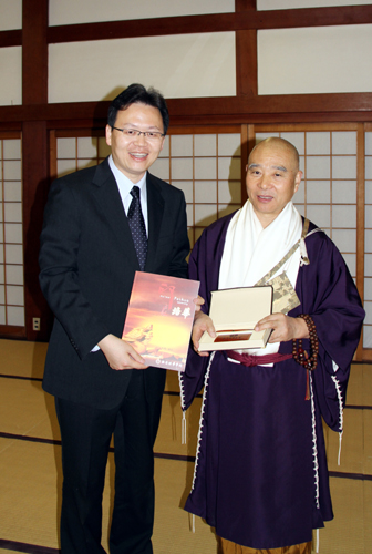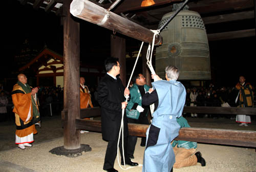 当天晚上,姜波理事长作为中日文化友好交流大使,与日本原财务大臣盐川正十郎先生共同敲响了2010年新年的第一声钟声,祝福两国人民喜迎新年。陕西电视台专程拍摄制组赴日本奈良进行采访,日本NHK国家电视台与陕西电视台合作完成了共同敲响新年钟声,为中日两国人民祈福新年。
