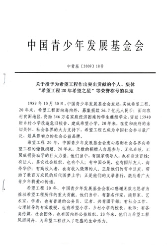 希望工程是一项利国利民、造福后代的崇高事业,需要社会各个方面的广泛支持和踊跃参与。我们期待社会各界一如既往地关心和支持希望工程的发展,始终关注和帮助广大青少年特别是有困难的青少年的健康成长,共同为推动科学发展、促进社会和谐贡献力量。附:“希望工程20年特殊贡献奖”获奖名单