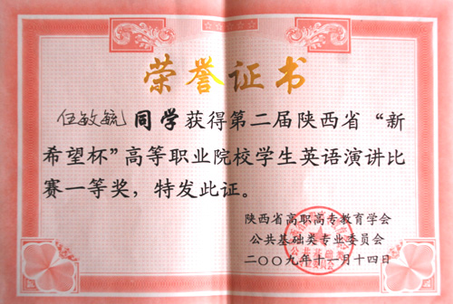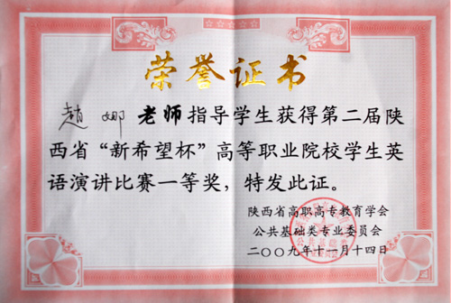 在11月4日结束的全省“新希望杯”高职高专英语演讲比赛中,我校外国语学院5Z071A班伍敏毓同学以总分第二名的好成绩荣获一等奖,教师赵娜获得指导教师奖。