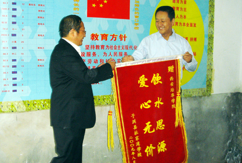 离子洲县城40余公里的杜家湾中学地处偏僻山区,这里资源匮乏,经济落后,自然条件差。由于缺乏教学资金,学校的教室长年未修,破败不堪,有的甚至成为危房,给教学工作和学生安全带来困难和隐患。我校院长姜波博士得知这一情况后,派专人到学校进行实地调查,并与当地政府的有关部门就捐资助学实施“希望爱心工程”达成初步意见。6月初,经学校研究,决定出资20万元帮助该校翻新整修教室和校园。经过近一个月的紧张施工,杜家湾中学教室、办公室、宿舍和校园焕然一新。为此,该校特意制作了一面写着“ 饮水思源,爱心无价”的锦旗赠送给我校,表达全体师生对我校的感激之情。