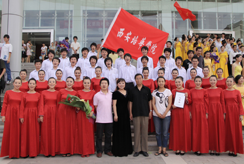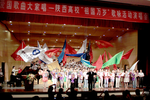 为迎接新中国成立60周年,充分展现我省广大师生的精神风貌和爱国热情。6月21日,由教育部发起、陕西省教育厅举办、陕西师范大学承办的“建国60周年爱国歌曲——陕西高校‘祖国万岁’歌咏活动”在陕西师范大学终南音乐厅隆重举行。我院姜波院长带队参加了比赛,艺术教育中心主任周玉昆教授,团委书记赵君慧一同观看了比赛。