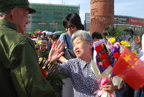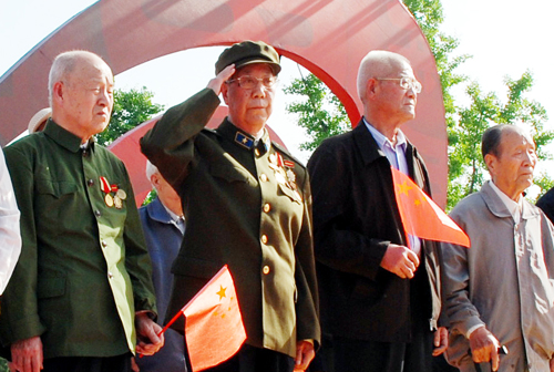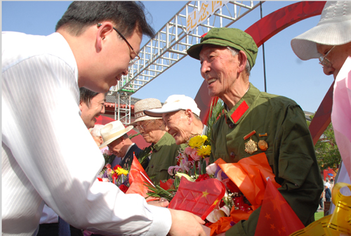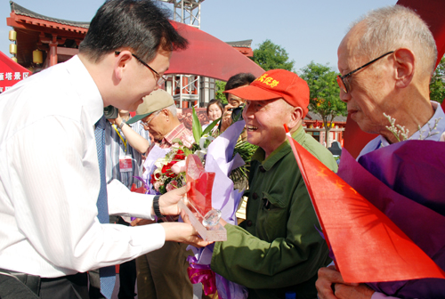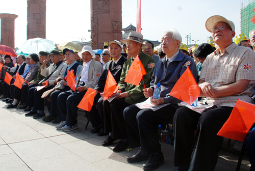 在嘹亮的紧急集结号声中,12名少先队员向老兵敬礼,在场市民悄然肃立,用崇敬的目光向舞台上的老兵致敬。号声在大雁塔上空久久回荡。翠华路小学20余名学生代表跑上舞台,将手中的鲜花献给老兵们,600只和平鸽从舞台右侧腾空飞起。集结号声将我们拉回到了那个战火纷飞的岁月,使我们想起了那些为祖国牺牲的同胞们。曾是解放军第一野战军6军16团司令部作战参谋的84岁老兵代表贾文海手捧鲜花缓缓地走上主席台致辞。他说:“在今天这个特殊的日子,能被大家惦记,我们作为老兵感到很欣慰。”讲话虽然简短,却感动了在场的每一个人。
