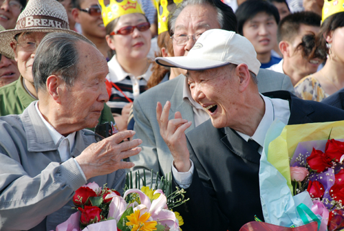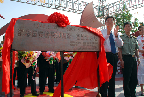 活动现场,许久未见的老兵们把手紧紧握在一起,每个人的眼里都有泪花在闪动。为了表达对西安解放的纪念,由西安市领导、省军区政治部领导、市委党史研究室、华商报社、我校姜波院长向30余名老兵代表颁发了“西安解放60周年”纪念品。在激昂的音乐声中,由我校特别支持的“纪念西安解放60周年·老战士足迹”系列铜像被抬上舞台,83岁的吕出老人缓缓步出,与省军区政治部老干处副处长田治平、西安市委党史研究室主任靳秀珍、我校院长姜波、华商报社总编辑鲍剑,共同向在场来宾及市民展示了“西安解放60周年·老战士足迹”的风采,采集到的36位老战士的脚印在掌声中与市民见面。“足迹”在庆典结束后会永久安放在大慈恩寺遗址公园,使人们得以缅怀他们的功勋。