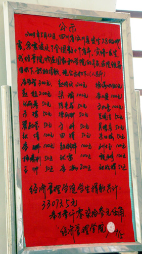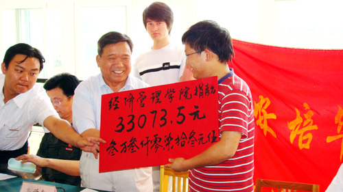 经济管理学院这次自发的捐款,是我校启动“托起希望 灾后学校重建行动”赈灾捐款活动启动后收到的最大一笔单项捐款。这份善款不仅代表者每一个经管人的对灾区人民的关心,更代表着众多培华人心手相连的爱心。我们有理由相信,在全国人民的群策群力之下,灾区人民一定可以重建美好家园。
