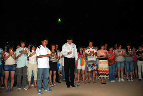 夜深了,点点烛光、颗颗爱心汇集成暖暖的祝福飞向四川灾区,飞向汶川。刚下晚自习的同学也自发地参与其中,大家一起默默祈祷,默哀……培华上空萦绕着淡淡的歌声久久不散:“这是心的呼唤,这是爱的奉献……”,歌声、烛光、眼泪融为一幅感人的画面。