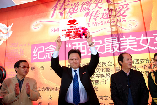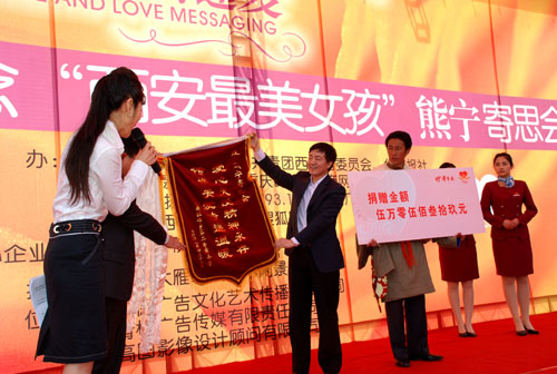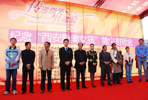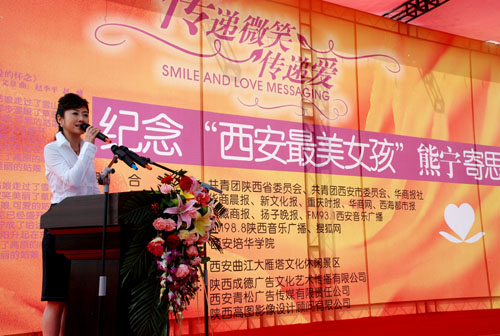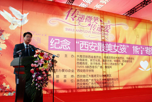 4月13日上午,姜院长参加了在西安大雁塔北广场隆重举行的“传递微笑传递爱——纪念西安最美女孩熊宁寄思会”。当天,来自全国各地的数千群众自发聚集在西安大雁塔北广场,共同为西安最美女孩熊宁送去最深情的怀念和祈福。寄思会上,青海玉树藏族自治州称多县拉布乡第二寄宿小学校长索南巴久代表青海方面接受了培华学院爱心捐赠的五万余元捐款。