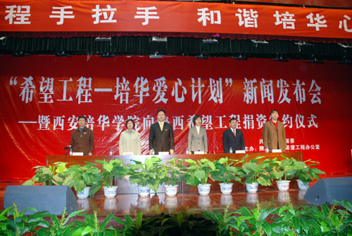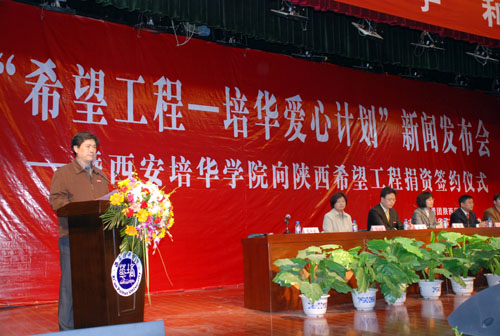 4月21日上午,我校和共青团陕西省委、陕西省实施希望工程办公室共同启动了2008 “希望工程-培华爱心计划”暨西安培华学院向陕西希望工程捐资签约仪式。大会由我校党委书记王斗虎主持。我校理事长、院长姜波与陕西省希望办主任陈如意签署捐赠协议书;共青团陕西省委副书记张小平和姜院长共同为“希望工程-培华爱心计划”揭牌;共青团陕西省委书记卫华出席仪式并致辞,人民日报、光明日报、中国青年报、陕西电视台、西安日报、华商报等二十余家媒体参加了发布会。