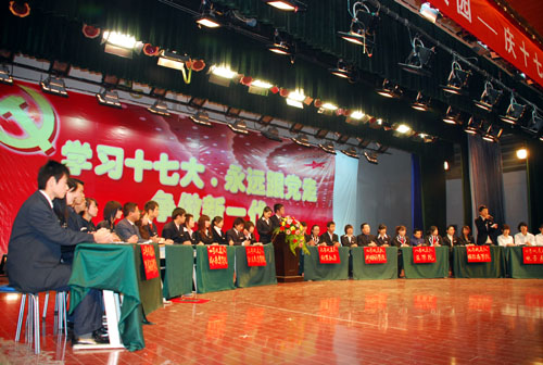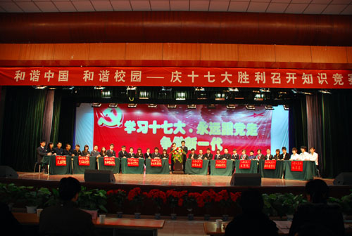 为了认真学习贯彻落实党的十七大精神,让我校学生更好地了解党情国情,由我校团委主办,校学生会承办的“和谐中国 和谐校园” 庆十七大胜利召开知识竞赛于12月18日下午在我校大学生活动中心隆重举行。