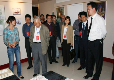 随后,专家们来到艺术设计学院,参观了成果展示厅。姜副院长提到了艺术设计学院是我校最早同日本、韩国等国家开展学术交流并互派留学生的院系之一。