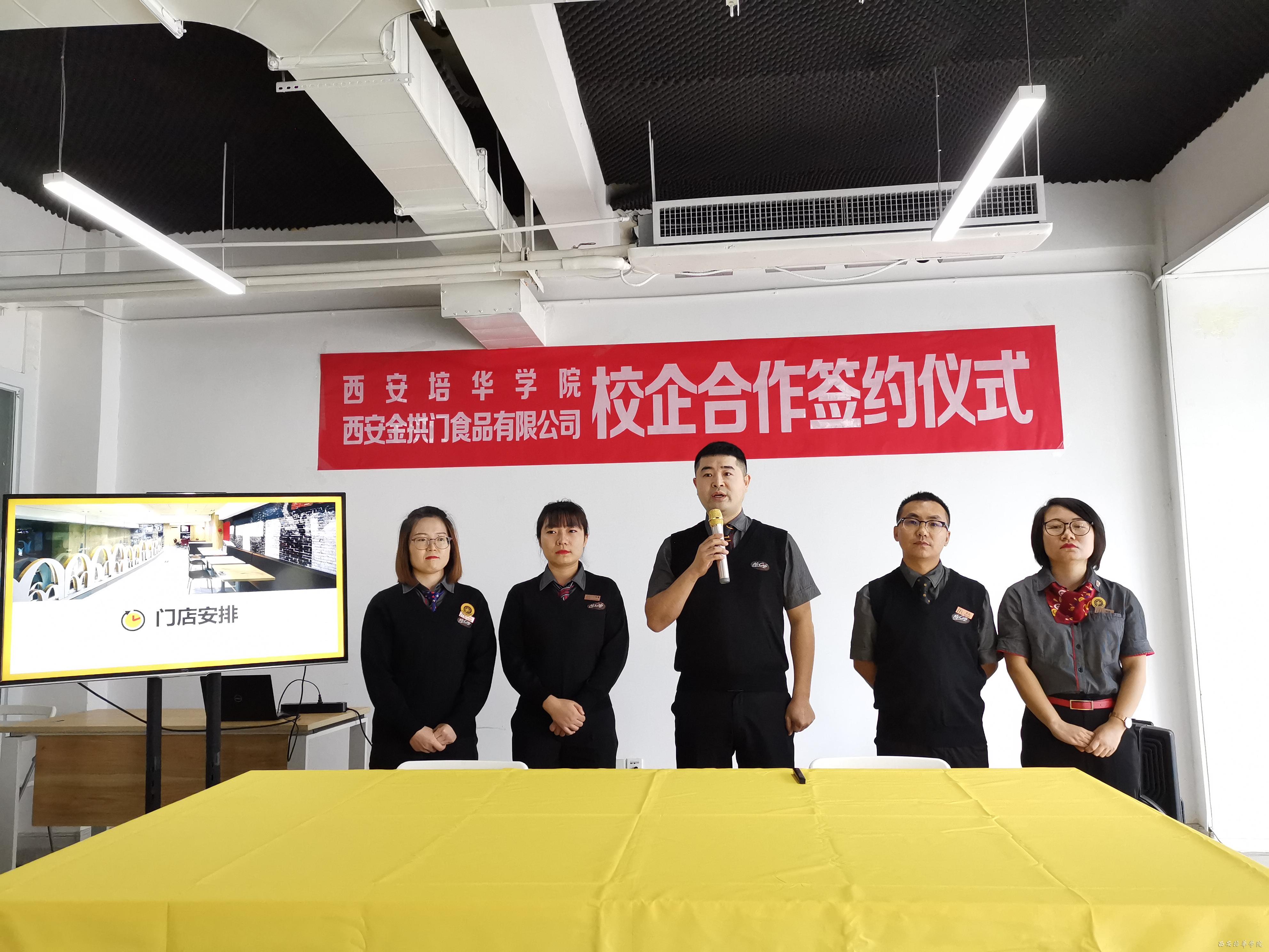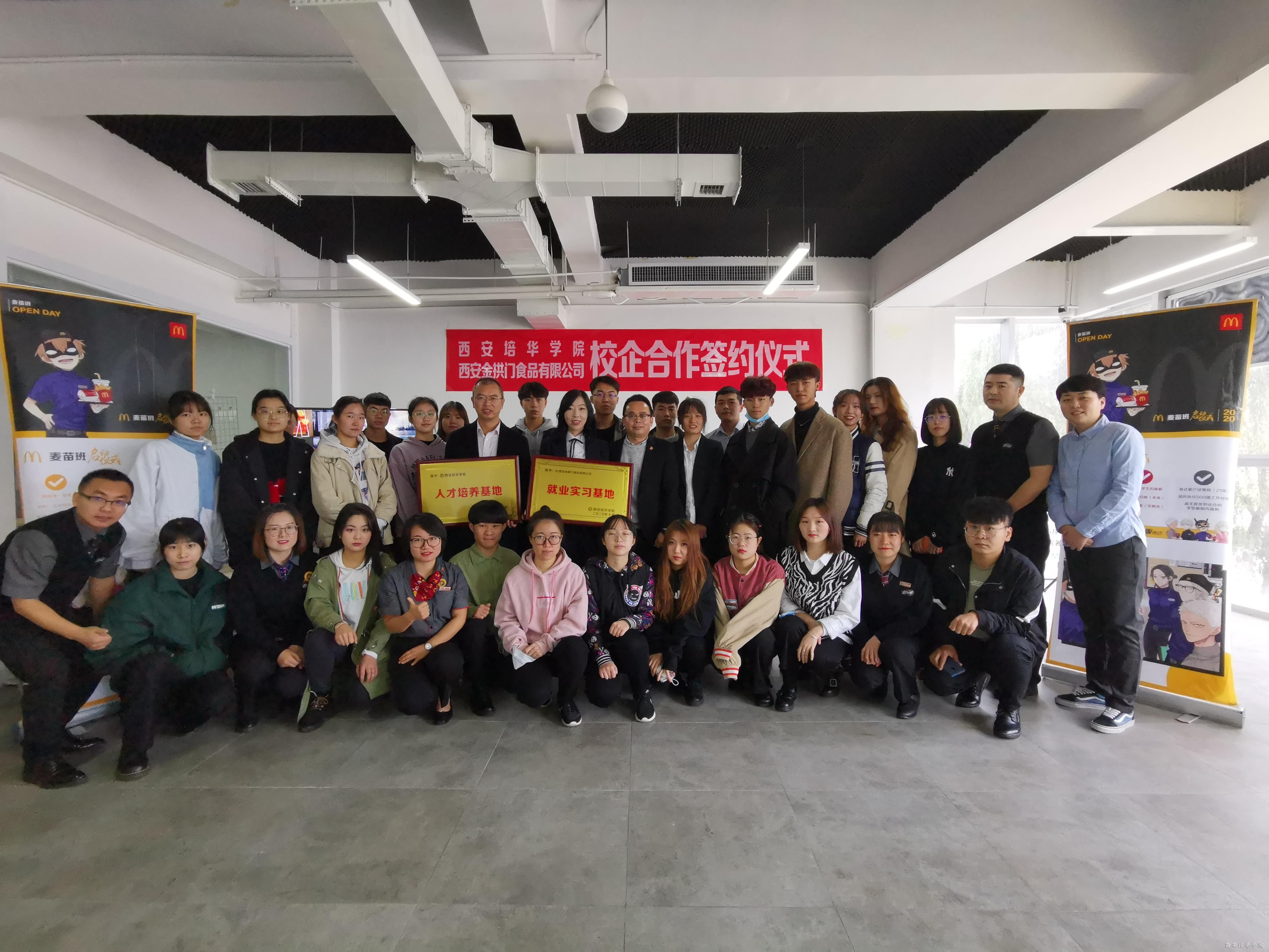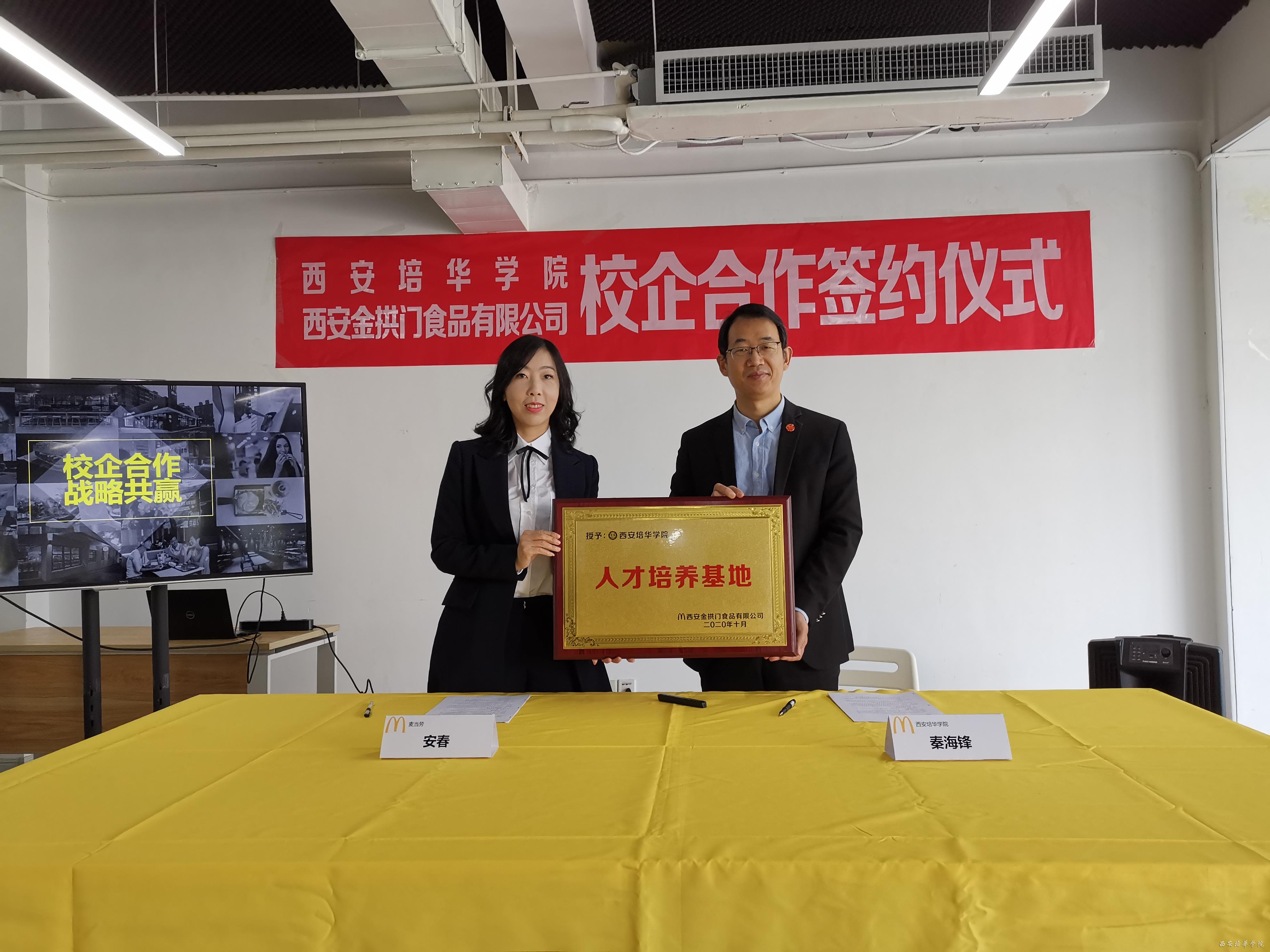 11月1日上午,西安培华学院与陕西金拱门食品有限公司(麦当劳公司)校企合作签约仪式暨“麦苗班”开班仪式在长安校区举行。麦当劳陕西分公司营运总监安春、营运经理顾堃、人力资源经理王璐,校长助理秦海锋、产学研协同创新中心副主任刘斌,以及麦当劳部分餐厅总经理和首批“麦苗班”首批学员参加了仪式。